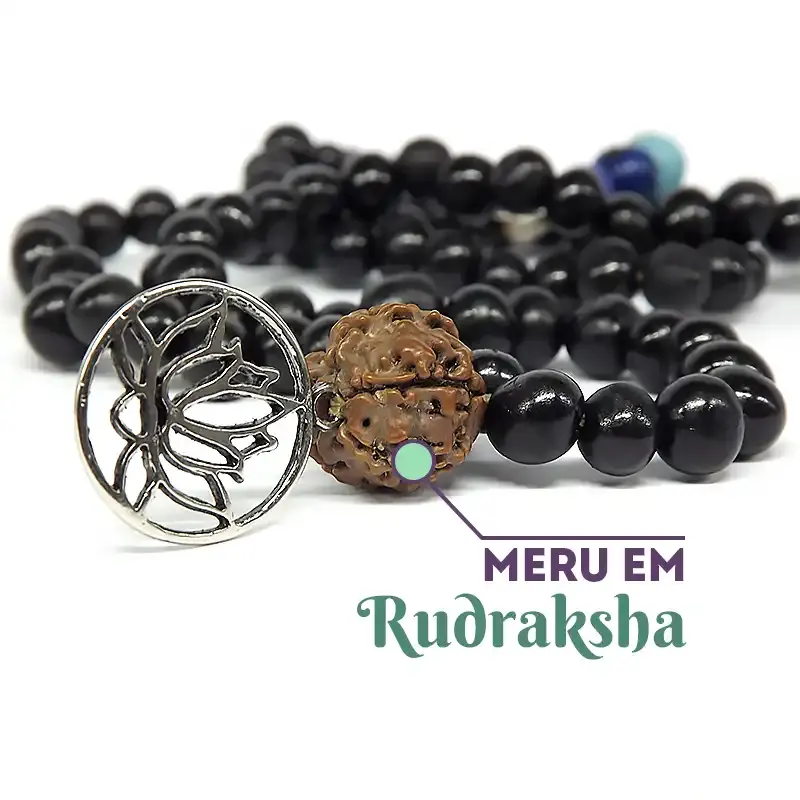 O marcador Meru, formado por uma semente de Rudraksha, uma semente sagrada que canaliza a proteção e a orientação divina.