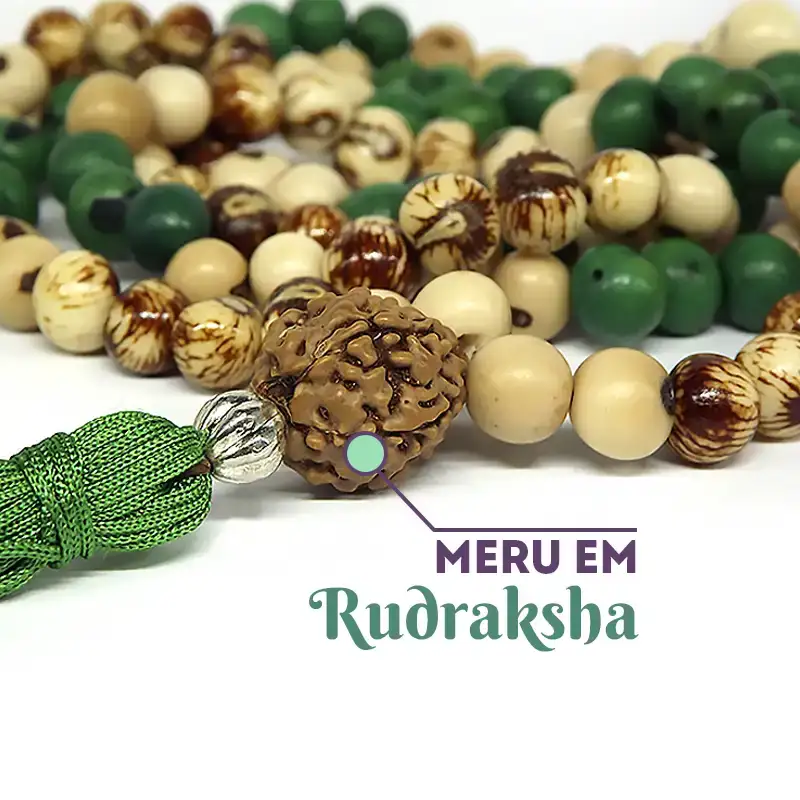 O marcador Meru, formado por uma semente de Rudraksha, transcende o elemento terreno. A Rudraksha é uma semente de significado espiritual profundo, acreditando-se que tenha brotado das lágrimas do Senhor Shiva. Ela é um lembrete constante de nossa jornada espiritual e da proteção divina.