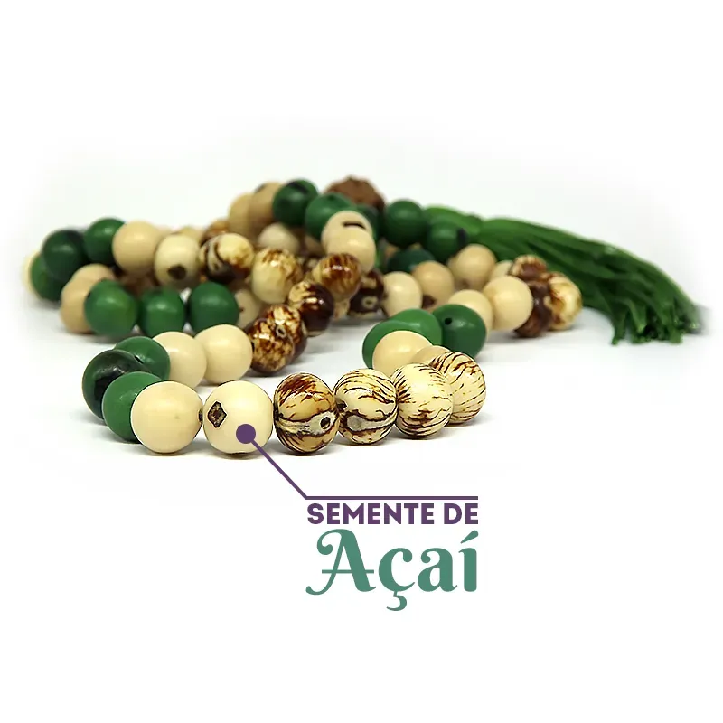 As sementes de açaí, em sua tonalidade verde vibrante, representam a interconexão entre a humanidade e a terra. A Rudraksha, com suas várias faces, nos relembra da importância de cultivar a espiritualidade em nossa jornada terrena.